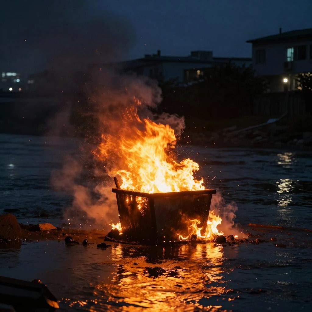 Dumpster fire river at night, glowing flames and embers scattered across a polluted waterway, eerie fog hovering above, dark urban background, cinematic lighting, digital art