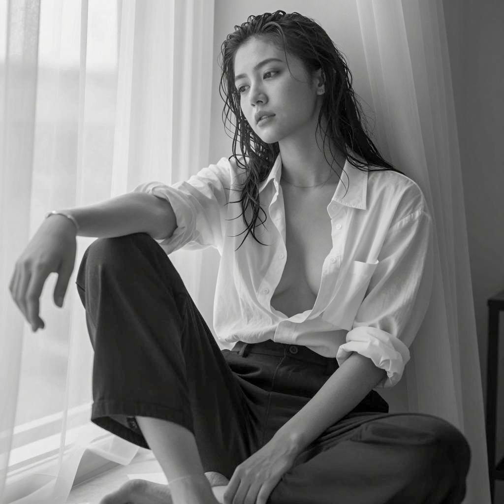 Black and white photograph of a woman with wet, dark hair sitting against a sheer curtain. She wears an open, white button-down shirt, exposing her left breast, and loose, black pants. Her right arm rests on her knee, and her left arm is extended outwards. She has a focused expression. Light streams through the curtain from the left. She wears a simple bracelet on her right wrist.