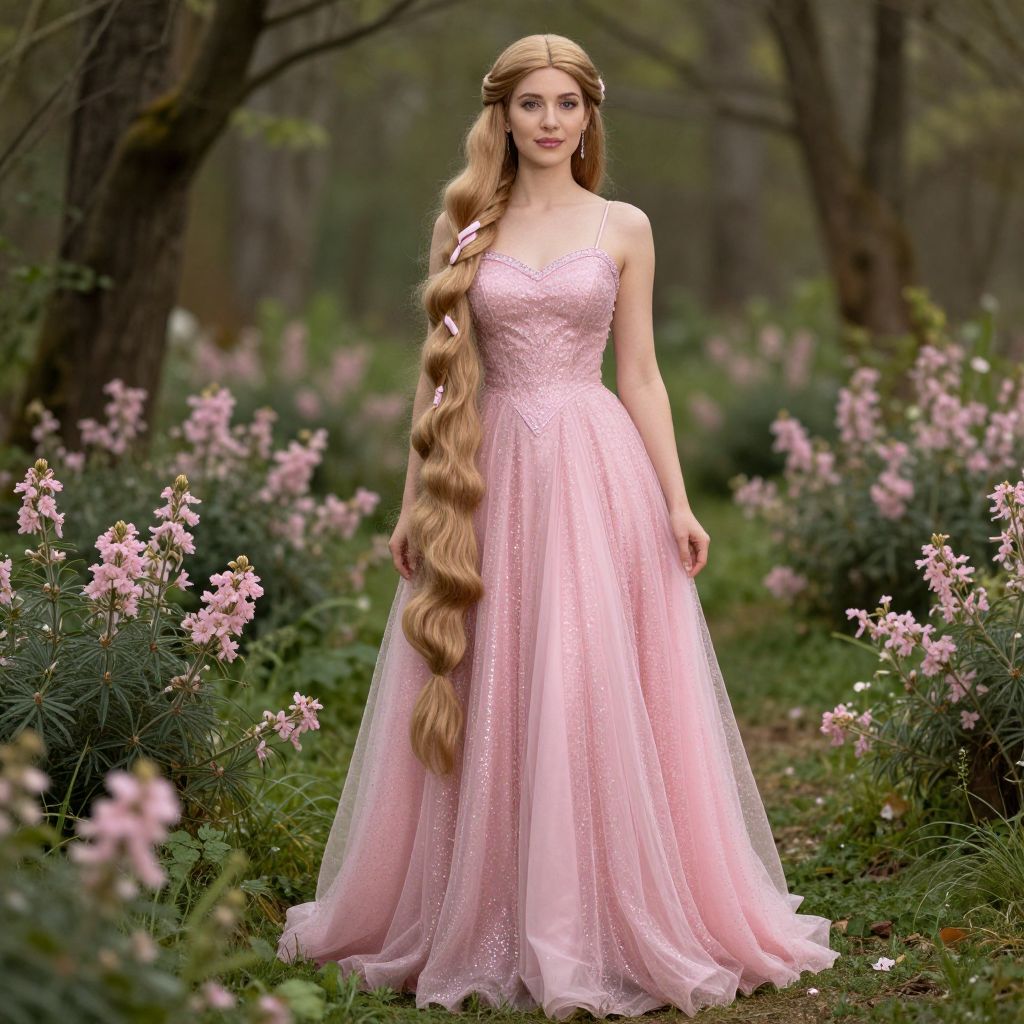 A beautiful woman with long, Rapunzel-like hair wears a long, pink, glitter-dusted dress in a forest adorned with pink flowers and greenery.