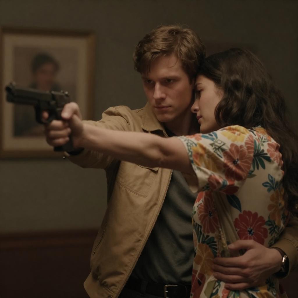 Dim Rustic Scene: Couple, Woman With Gun