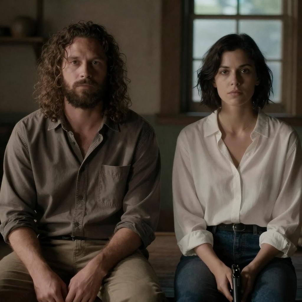 Photograph of two people in a dimly lit, rustic room. A man with long, curly hair and a beard sits on the left, wearing a brown shirt. A woman with short, dark hair and a white blouse sits on the right, holding a gun. The background includes wooden walls and a window with blue light.