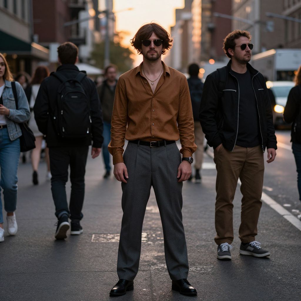 A man with a brown shirt and gray pants is standing on a street. He has a brown wig on his head, and is wearing sunglasses. There are other people in the background, including a man in a black jacket and brown pants. The scene is set in a busy city street at dusk, with the warm hues of the setting sun casting long shadows. The man's demeanor is confident and composed, exuding a sense of mystery and intrigue. The overall atmosphere is lively and dynamic, capturing the essence of urban life at its most vibrant.