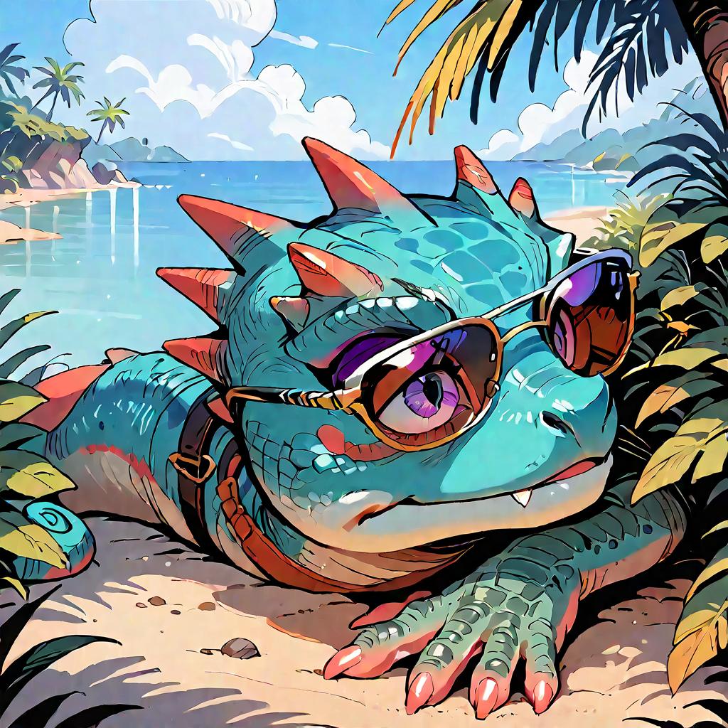 Score_9, score_8_up, score_7_up, source_anime, Chameleon, lizard, back spikes, feral, scales, outdoors, multicolored, in a tropical beach, sunglasses, relaxing