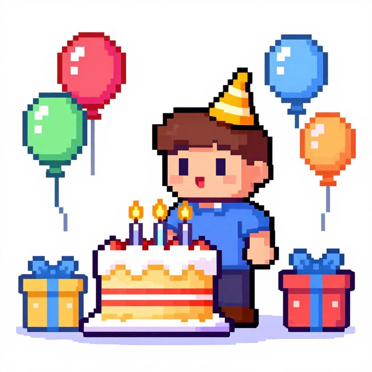 Birthday pixel art featuring a pixelated character blowing out candles on a birthday cake, surrounded by vibrant balloons and presents, 8-bit style with nostalgic charm