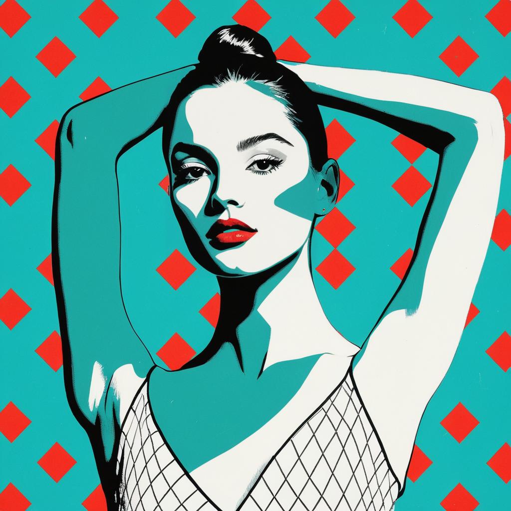 Pop art style portrait of a ballet dancer mid-pose, bold red lips, flat vibrant colors, high contrast, layered with checkerboard pattern in turquoise, coral, and white, silhouette-style face and hand with no gradients or shading, expressive and modern aesthetic, minimalist line art