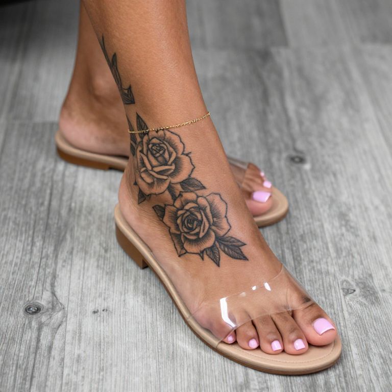 Photograph of a dark-skinned person's foot wearing a transparent sandal. The foot features a detailed black tattoo of roses on the outer side. The person has a small ankle tattoo and wears a delicate gold anklet. The background shows a wooden floor with a grayish hue. The toenails are painted a light pink.