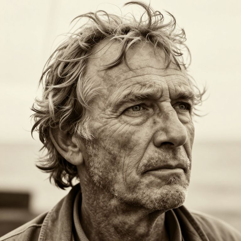 A close-up portrait photograph captures a seasoned sea captain's rugged features and wistful blue eyes in a three-quarter view. His stoic expression conveys resilience and weariness, while subtle lighting highlights the creases around his eyes and mouth, emphasizing a life of experience. The sailor's wild mane, now salted with pepper, reflects his bond with the open sea. Encapsulating his adventurous spirit, the image adopts soft, warm tones reminiscent of vintage sepia photographs, creating a nostalgic atmosphere that evokes admiration and empathy for this weathered mariner.