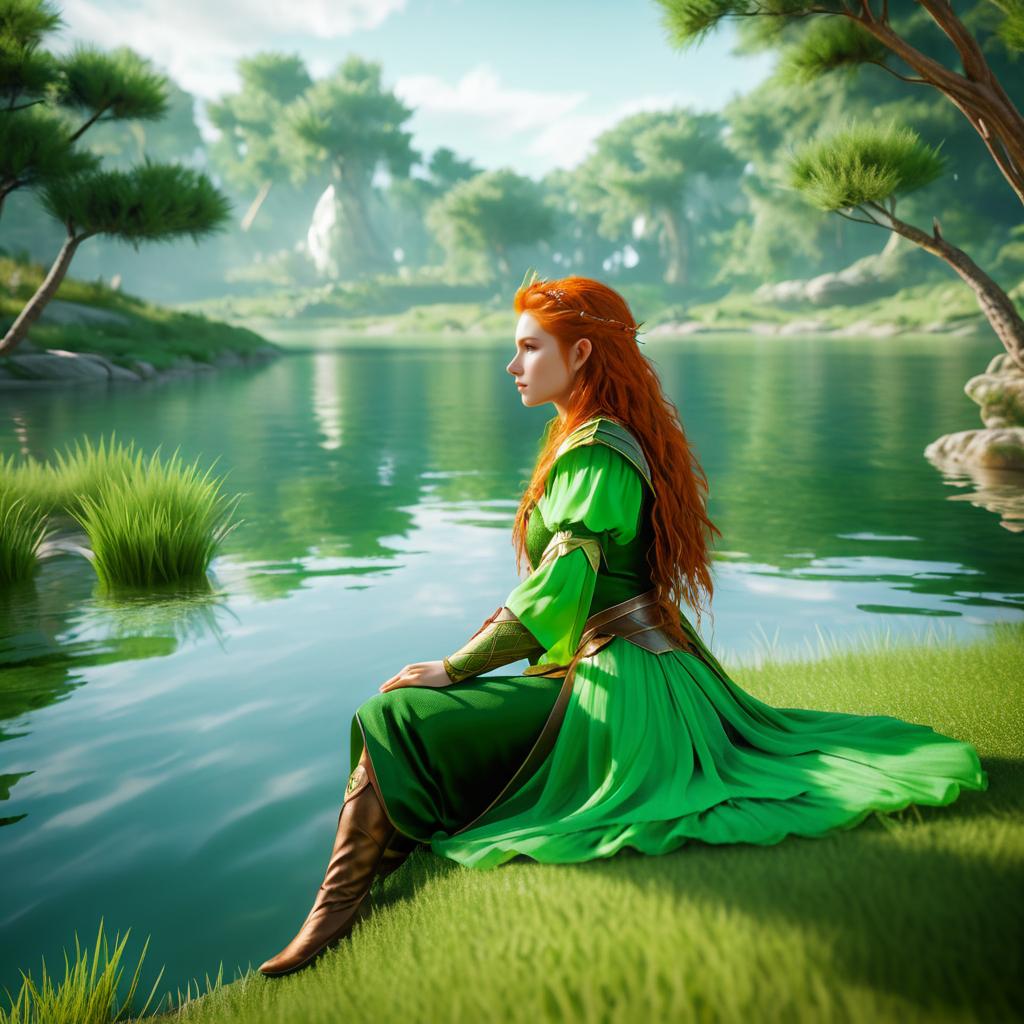 A red-haired elven woman dressed in an elegant green medieval-style gown with gold armor accents sits thoughtfully by a serene forest lake. She wears a green gemstone pendant and a leafy crown, surrounded by lush greenery and calm water reflecting the natural environment.