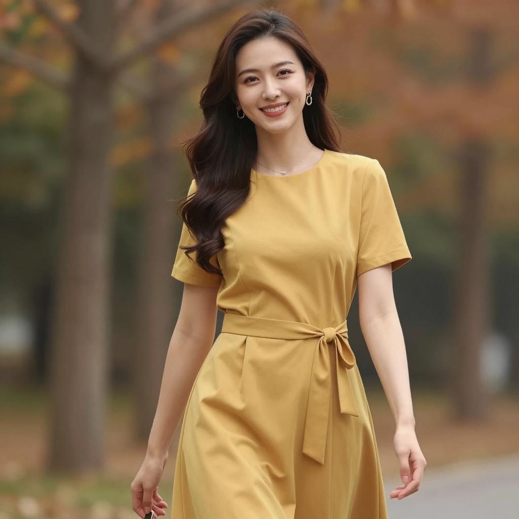 Portrait of a young Asian woman wearing a yellow satin dress with orange flower decorations. She has her hair styled in an elegant updo, smiling with arms outstretched in a brightly lit indoor room. The background features blurred floral arrangements in vases and framed artworks on the walls. She is accessorized with a delicate gold necklace.