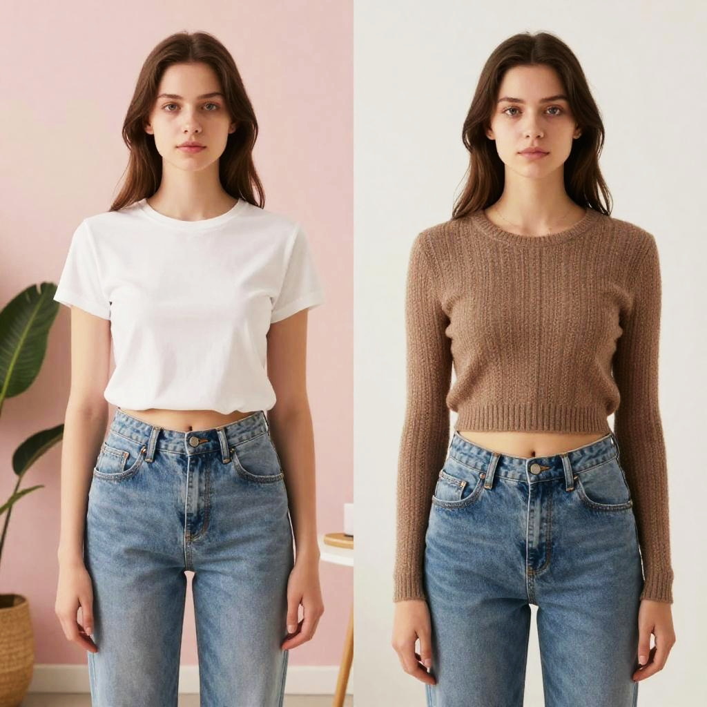Photograph of a young Caucasian woman with long, straight brown hair standing against a pink wall. She has a slender build and fair skin. On the left, she wears a white, short-sleeved, cropped t-shirt and high-waisted blue jeans. On the right, she wears a brown, long-sleeved, cropped knit sweater and the same high-waisted blue jeans. A green potted plant is partially visible in the left background. The image is split vertically, showing her in two different outfits. The lighting is bright and even, highlighting the textures and colors of her clothes.