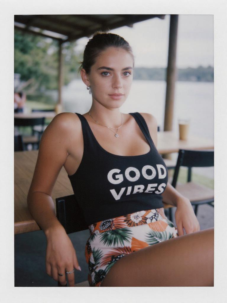 A lean woman in a black tank top with GOOD VIBES print and high-waisted tropical shorts, minimalist jewelry, captured in a lomography analog photo style, lounging at a bistro table by a lakeside retreat. Sexy. Pretty face and beаutiful eyes. Big breasts