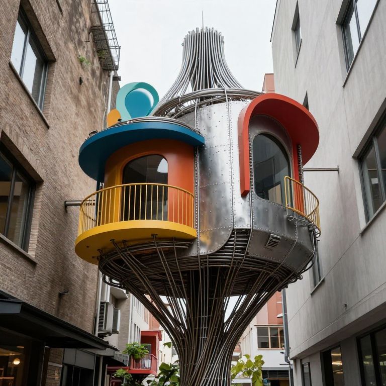 A highly detailed, cyberpunk-style treehouse made of woven steel cables and metal panels, suspended in an urban alley, with modernist colors and a Lebbeus Woods-inspired design.