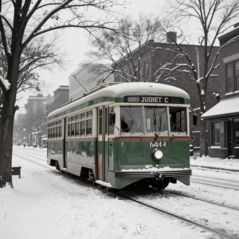 Photograph of a vintage green streetcar with "JUBILEE" and "6141" displayed on its front, driving along snow-covered tracks. The streetcar has a rounded front and large windows, with a white roof dusted with snow. Bare trees line the street, and buildings with dark, snow-covered roofs are in the background. The scene is set in a wintry urban environment, with a high-contrast black-and-white filter enhancing the snow and shadows. The streetcar's headlights are on, adding a touch of brightness to the otherwise muted, snowy landscape.