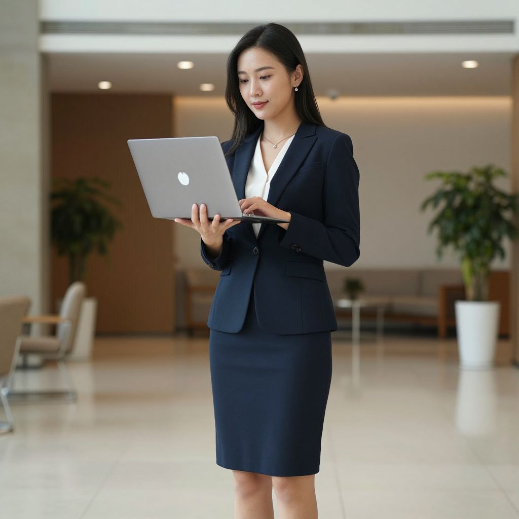 Photograph of an Asian woman in a black suit and knee-length skirt, holding a silver MacBook in a modern, brightly lit office with potted plants