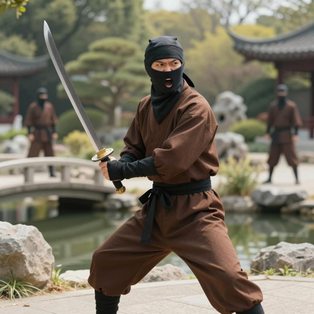 Man with dark skin and short, braided hair, wearing black clothing, holds a katana in a defensive stance on a rooftop. Background includes an industrial area with buildings and trees under a cloudy sky. Wooden shelf with a small orange object and white cloth on the right. Roof has a rusted metal edge.