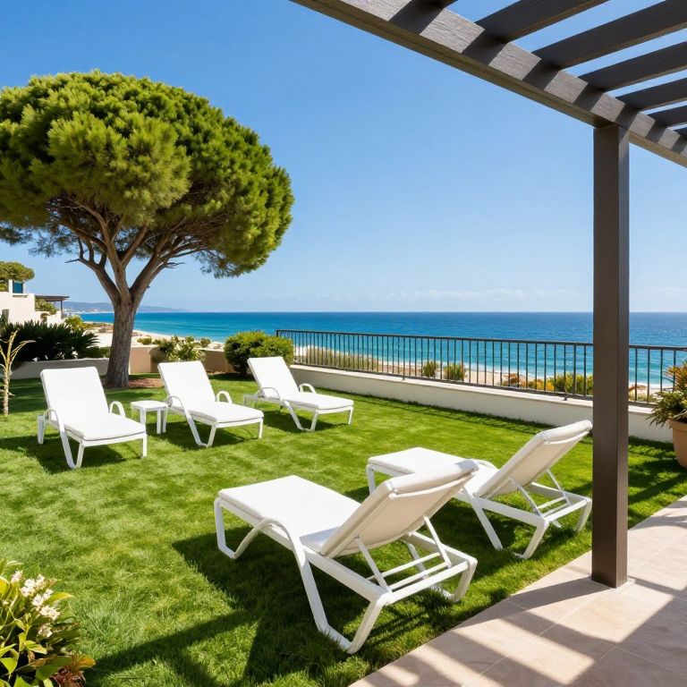 Spectacular view of the Algarve coastline unfolds from a luxurious hotel balcony, featuring a pristine lawn with four white sun loungers, vibrant green trees, and a serene ocean horizon framed by a modern railing and pergola.