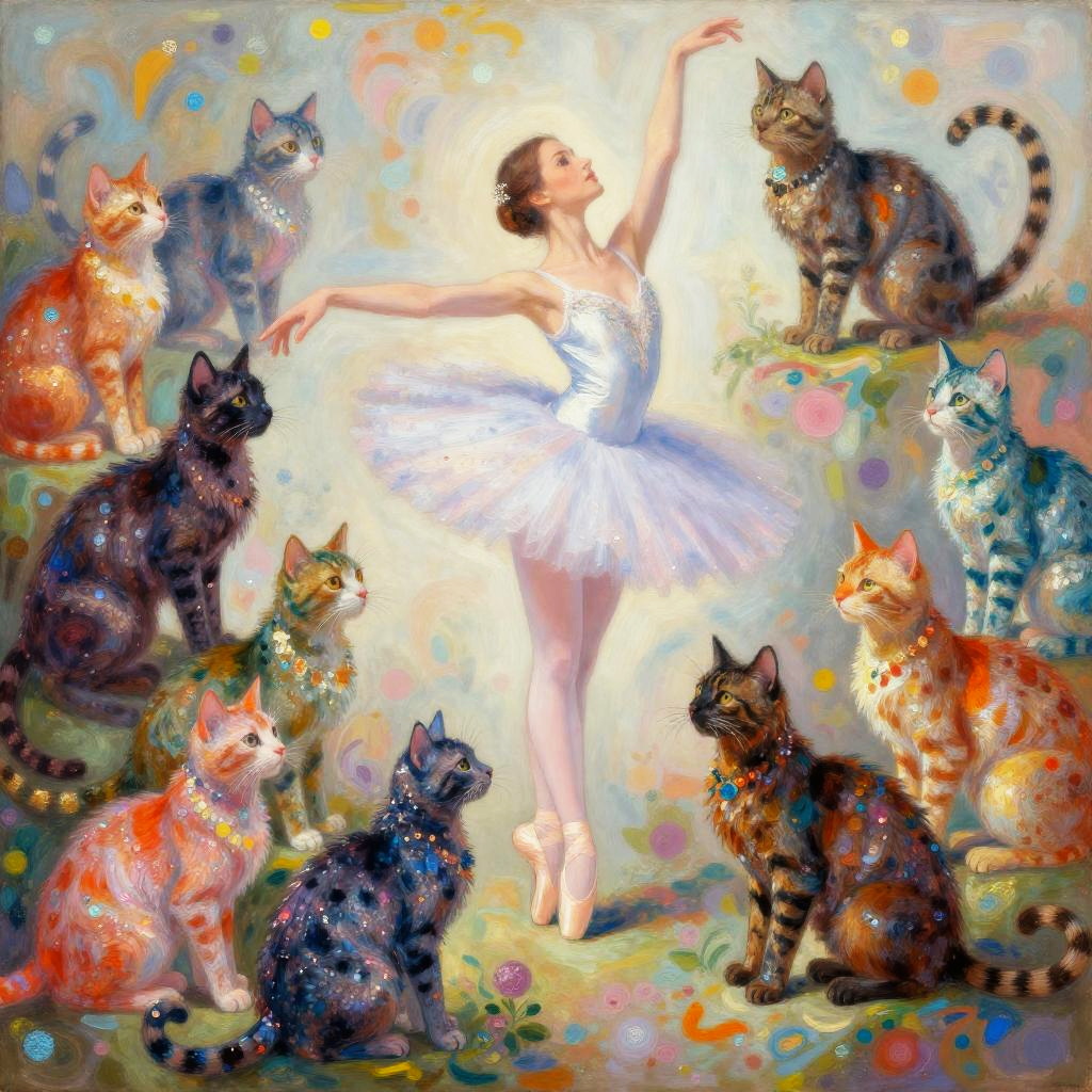 A ballerina surrounded by an unreasonable amount of graceful shimmering cats, in vivid psychedelic colors. Inspired by Arthur Frank Mathews, Alisa Burke, Anna Silivonchik, and Bill Bell.