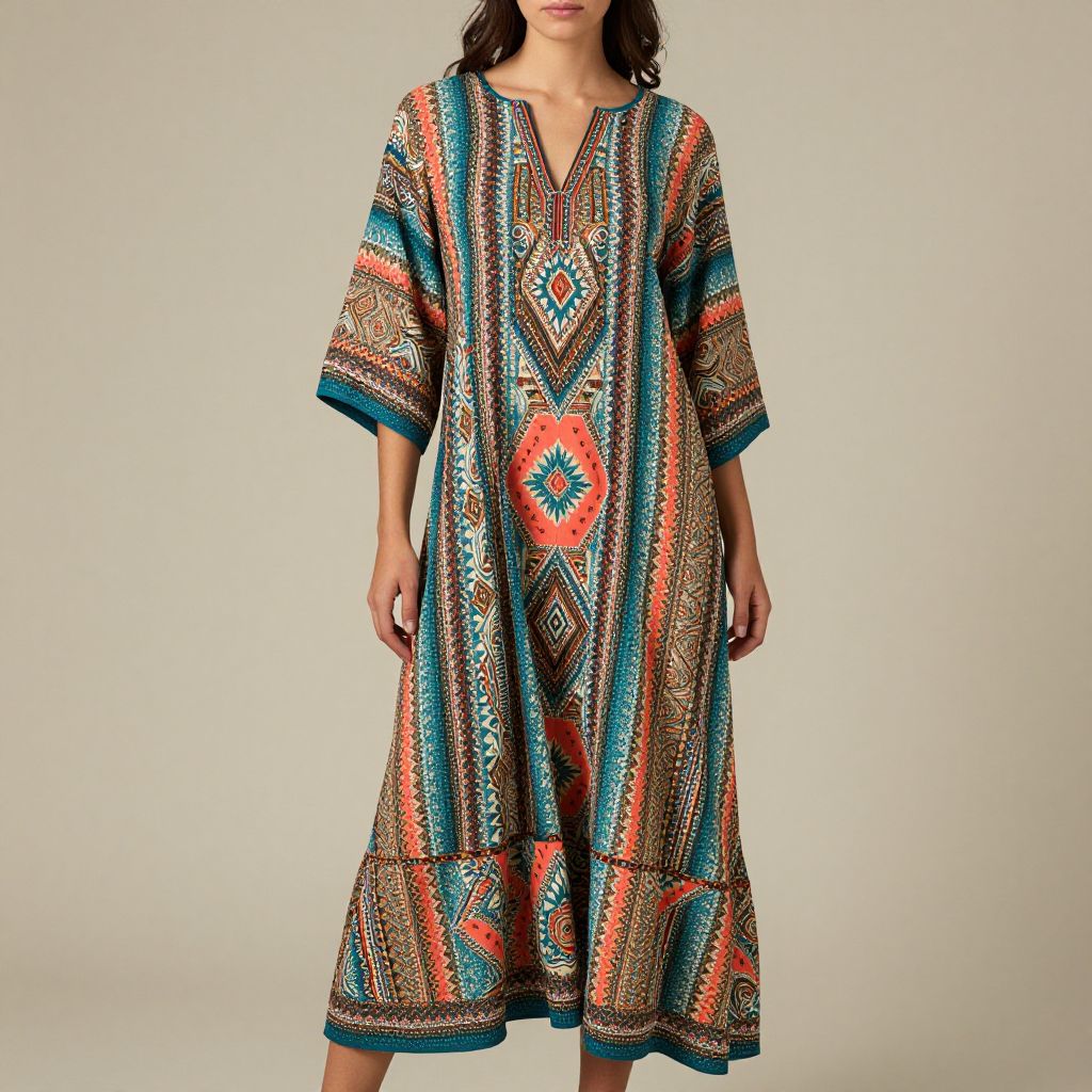 A woman elegantly showcases a vibrant retro bohemian maxi dress featuring intricate geometric patterns in rich hues of teal, coral, and earthy tones, complemented by half sleeves and a relaxed silhouette, exuding a high-definition, vintage-inspired aesthetic.