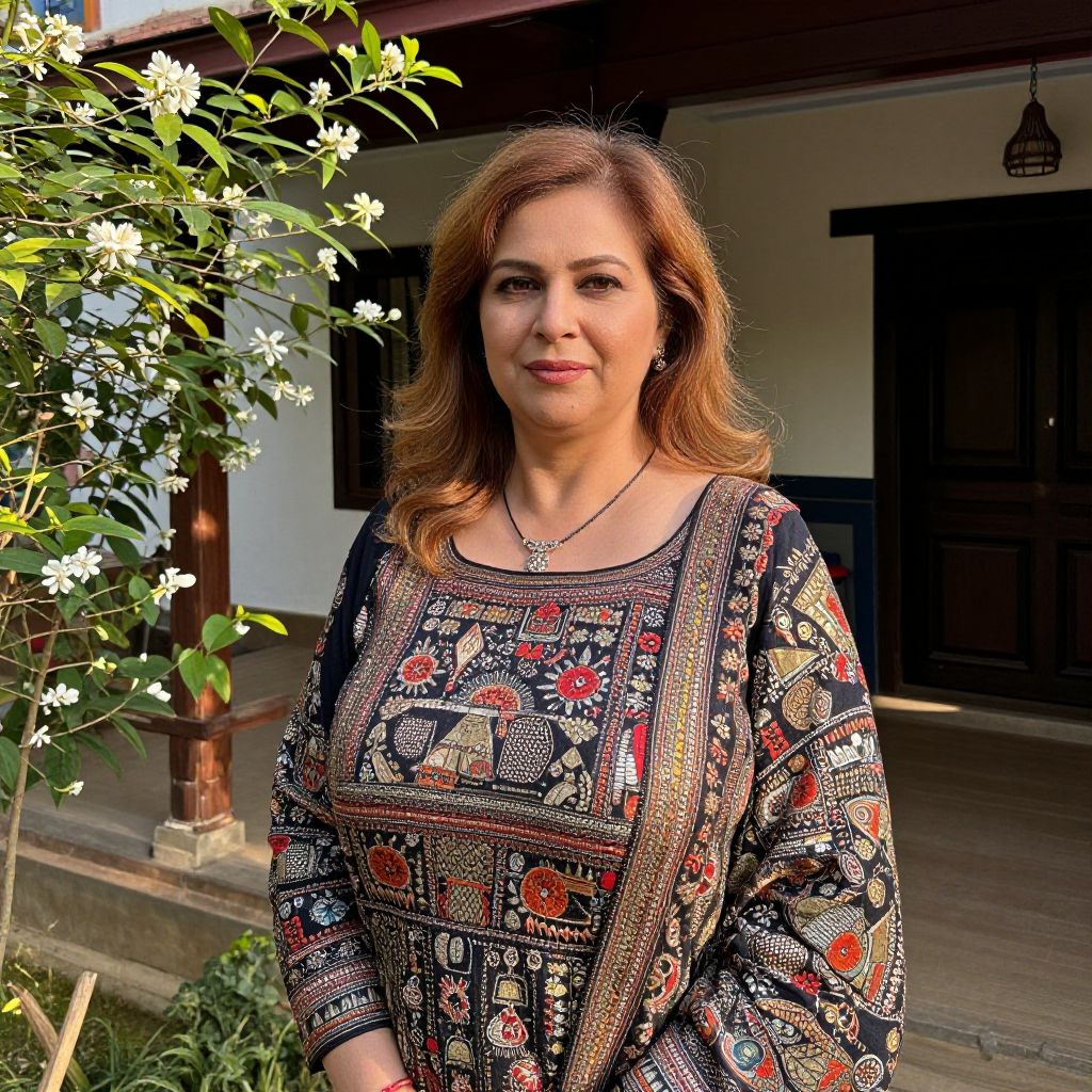 Photographic shot of a middle-aged woman with a calm facial expression, wavy auburn hair, and a gentle smile dressed in a beautifully embroidered patola chaniya choli, the fabric shimmering with intricate patterns that resemble traditional Bhakti-era art, standing outdoors on a wooden veranda of a heritage home in Kathmandu, surrounded by traditional Nepali plants like jasmine and hibiscus, afternoon sunlight filtering through the leaves. The woman has big tits and cute face