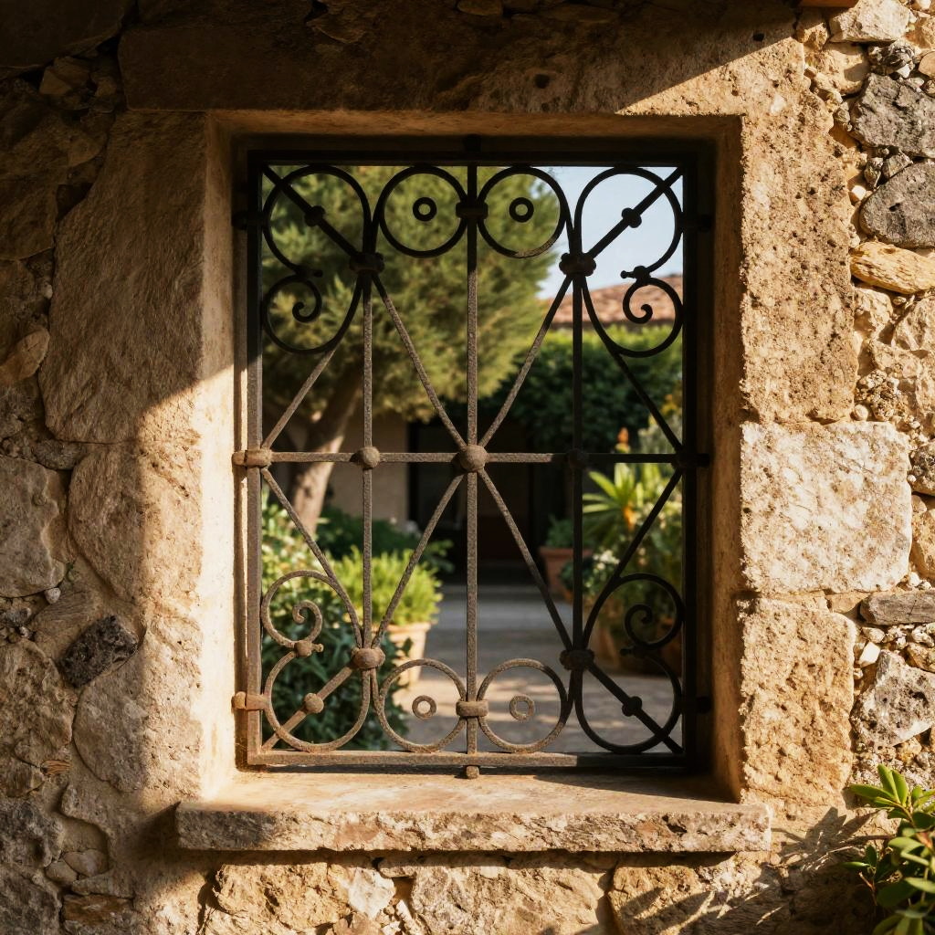 Ombriгёres architectural detail, intricate wrought iron patterns blending with soft sunlight, rustic Mediterranean stone walls, lush courtyard background, high contrast shadows and golden hour ambiance, ultra-detailed texture design, warm earthy tones