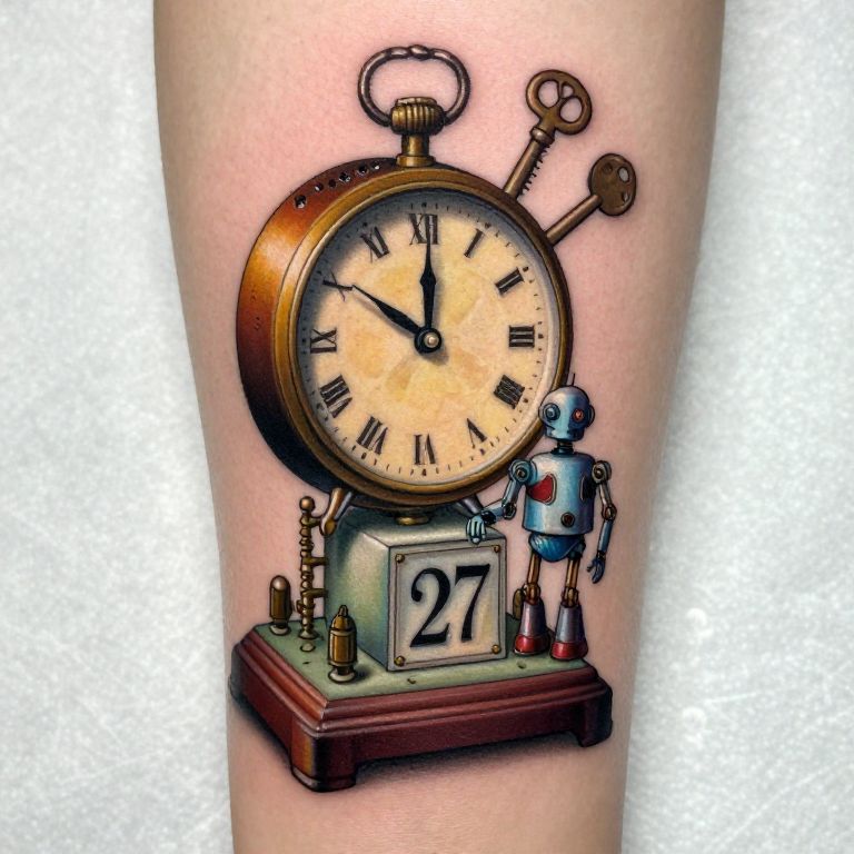 Phonograph ultrarealistic image that could be used as a tattoo. Incorporate a clock, keys, then number 27, robot in the style of Dali,