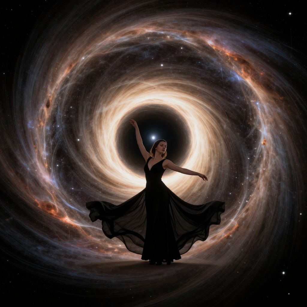 A woman in a flowing black gown stands poised against the cosmic backdrop of a glowing black hole, its radiant ring of stars swirling like an ethereal dance floor, defying the boundaries of space and time.