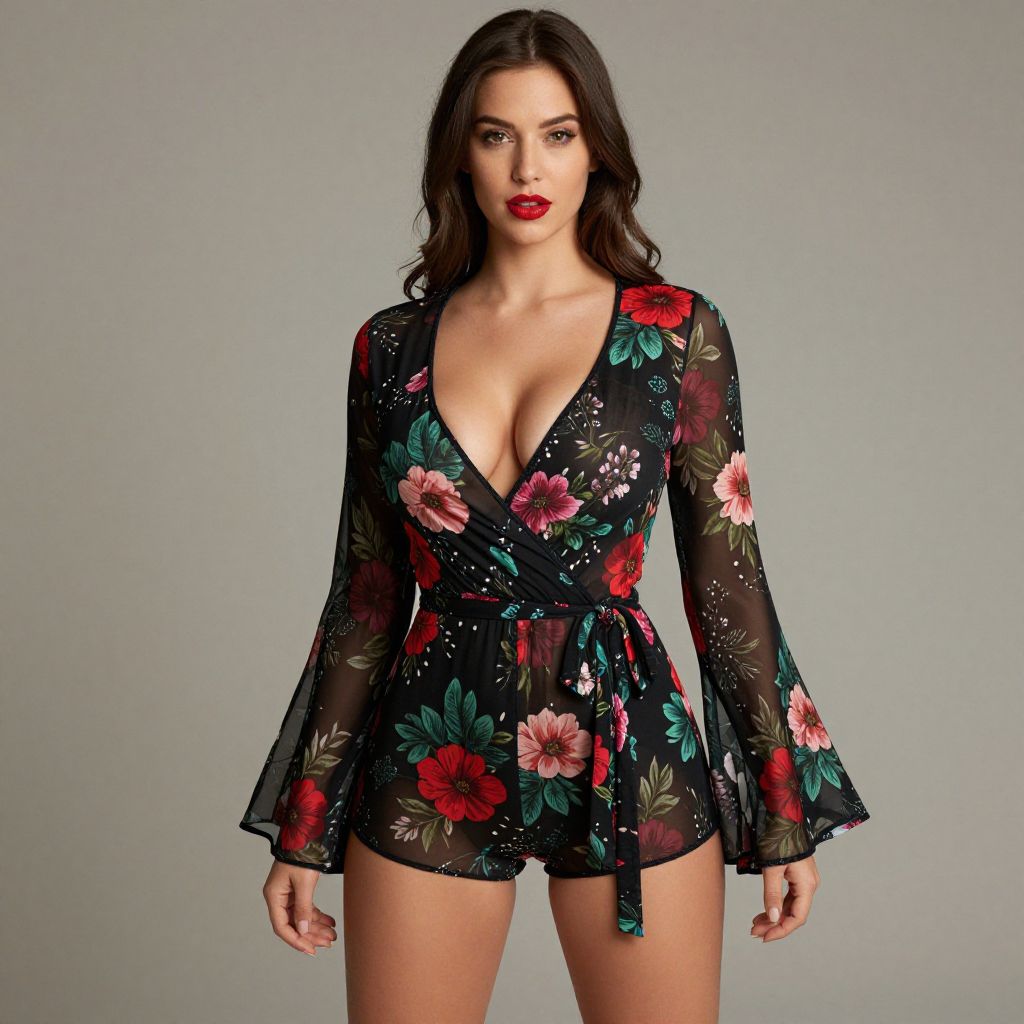 "Woman, flirty bohemian, sheer black romper with vivid floral print in reds, greens, and pinks, deep V-neckline, wrap style with a side tie belt, long flared sleeves, mid-thigh length, minimal makeup with bold red lipstick, solid colored studio background.. Sexy. Pretty face and beаutiful eyes. Big breasts."