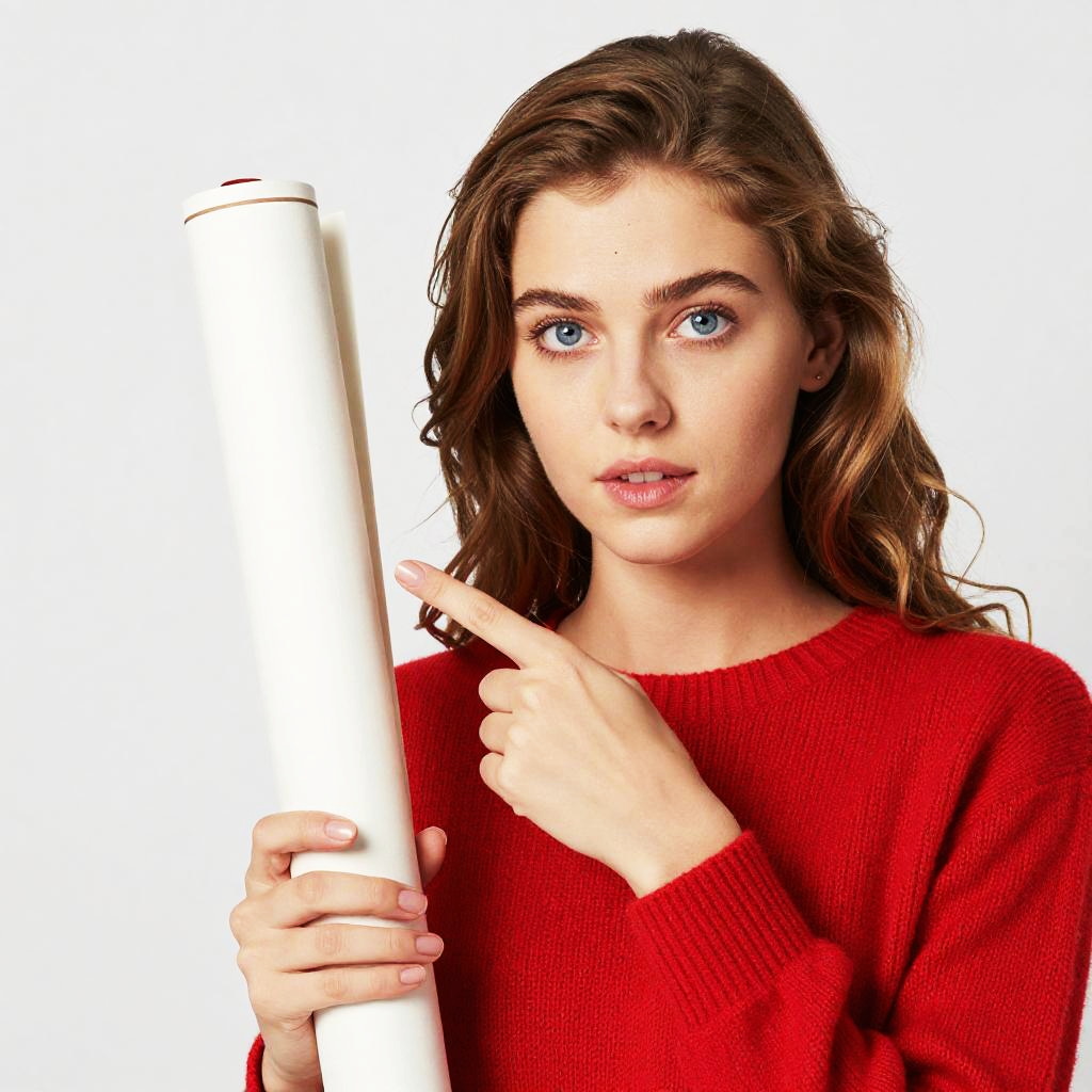 Photograph of a young Caucasian woman with fair skin and wavy brown hair, wearing a red knit sweater, holding a blank, white roll of paper vertically in her right hand. She has bright blue eyes, full lips with a subtle pink gloss, and is pointing to the roll of paper with her left index finger. The background is completely white, making her and the roll of paper the focus. Her expression is curious and slightly inquisitive. The image has a high-contrast, studio-lit look.