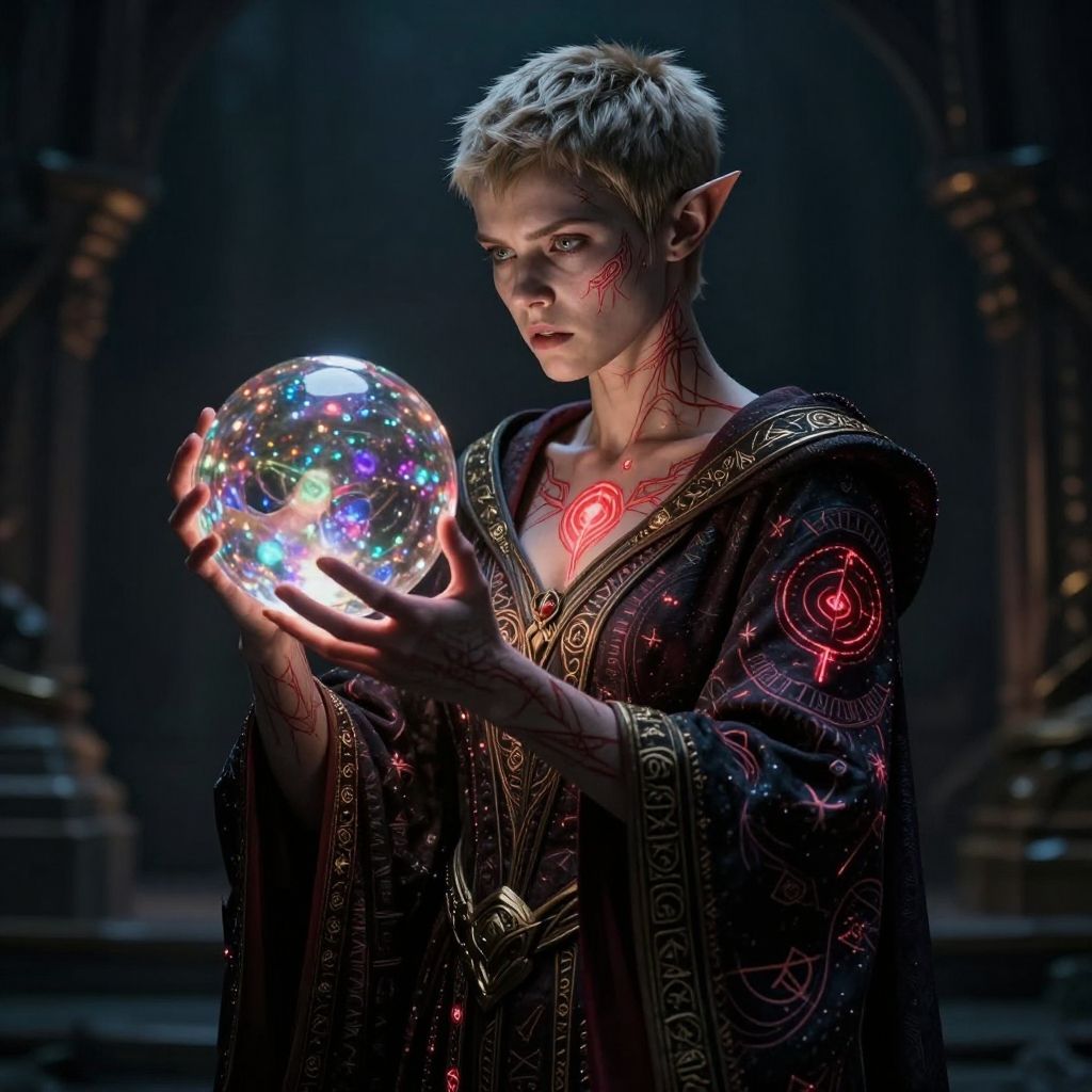 Photorealistic digital artwork of an elf-like woman with short, platinum blonde hair and pointed ears. She has pale skin and red, glowing tattoos on her face and chest. She wears a detailed, black, ornate robe with gold and red patterns. She holds a glowing, crystal orb filled with colorful lights, illuminating her face. The background is dark and blurred, featuring arches and pillars, suggesting a mystical or ancient setting. The lighting emphasizes the orb's brightness, casting a soft glow on her face and robe. Her expression is focused and slightly intense.