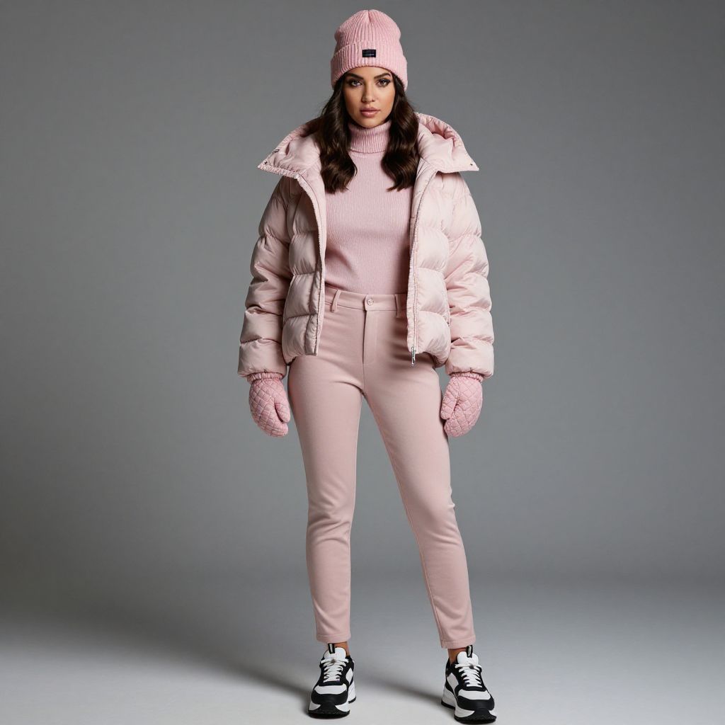 "Woman, modern winter chic, light pink quilted puffer jacket with oversized collar and hood, matching quilted mittens, ribbed-knit beanie, coordinating light pink turtleneck sweater, high-waisted slim fit trousers, black and white chunky sneakers, photo studio background.. Sexy. Pretty face and beаutiful eyes. Big breasts."