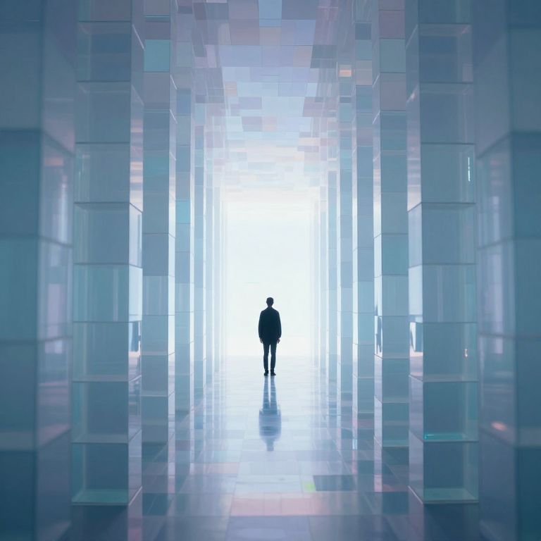 A solitary figure stands at the center of an infinite corridor lined with stacked, translucent blocks that stretch toward a radiant, pixelated horizon, defying gravity and perspective in a dreamlike, digital expanse.