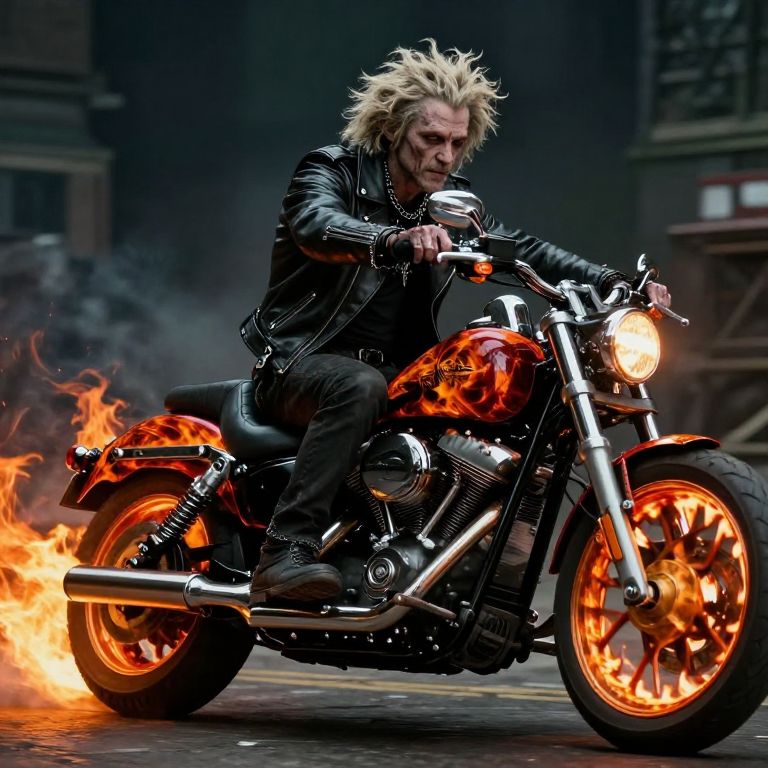 Photograph of a fierce, blonde-haired man in a black leather jacket riding a flaming orange motorcycle through a dark, smoky urban street.