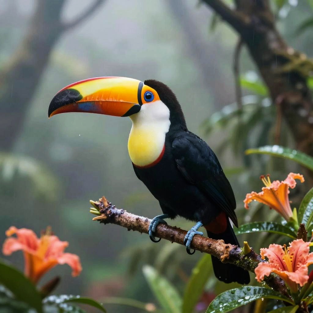 Highly detailed illustration of a colorful toucan perched on a branch, in a dense Amazon rainforest with vibrant flowers, with misty morning light with gentle rain droplets, soft textures, serene mood, intricate feather details, HD quality, gentle shadows, creating an inviting atmosphere for relaxation