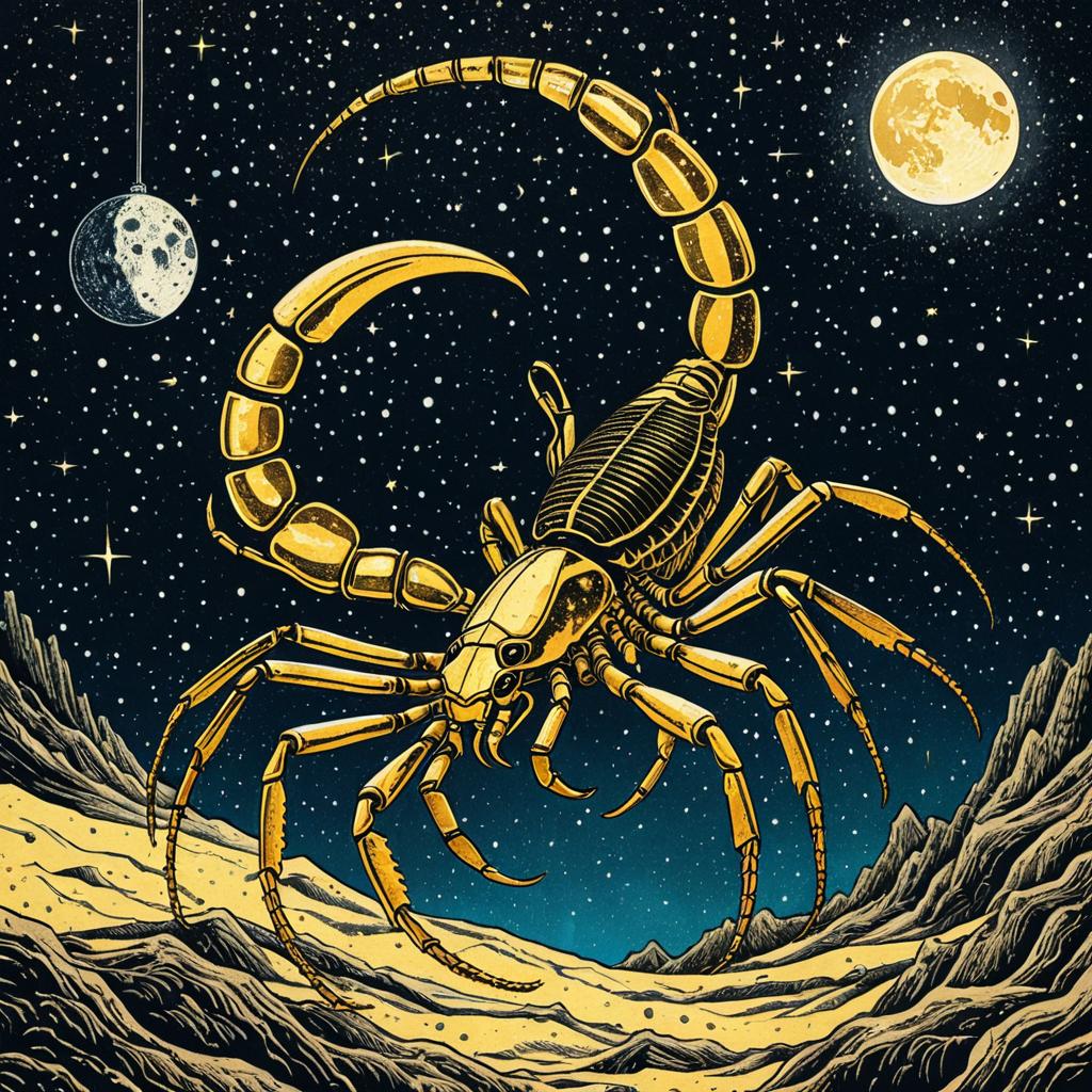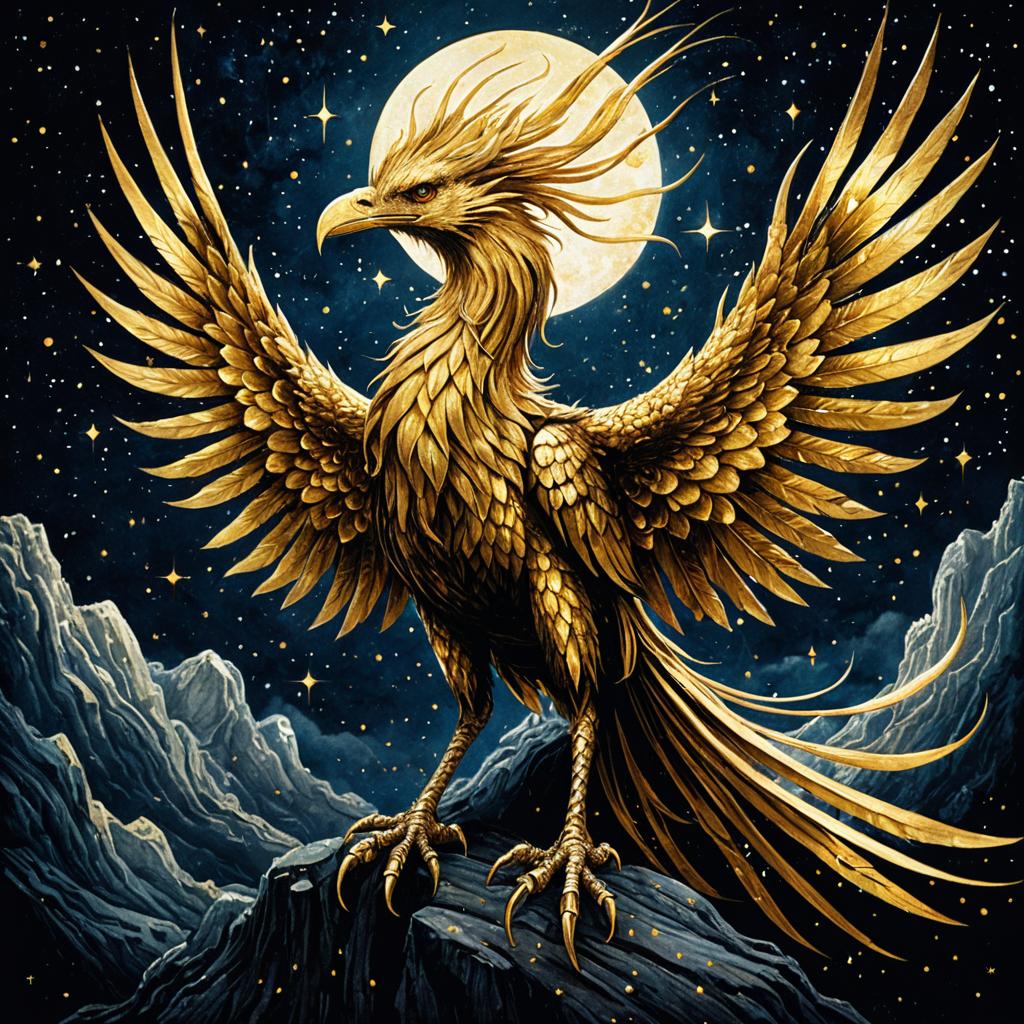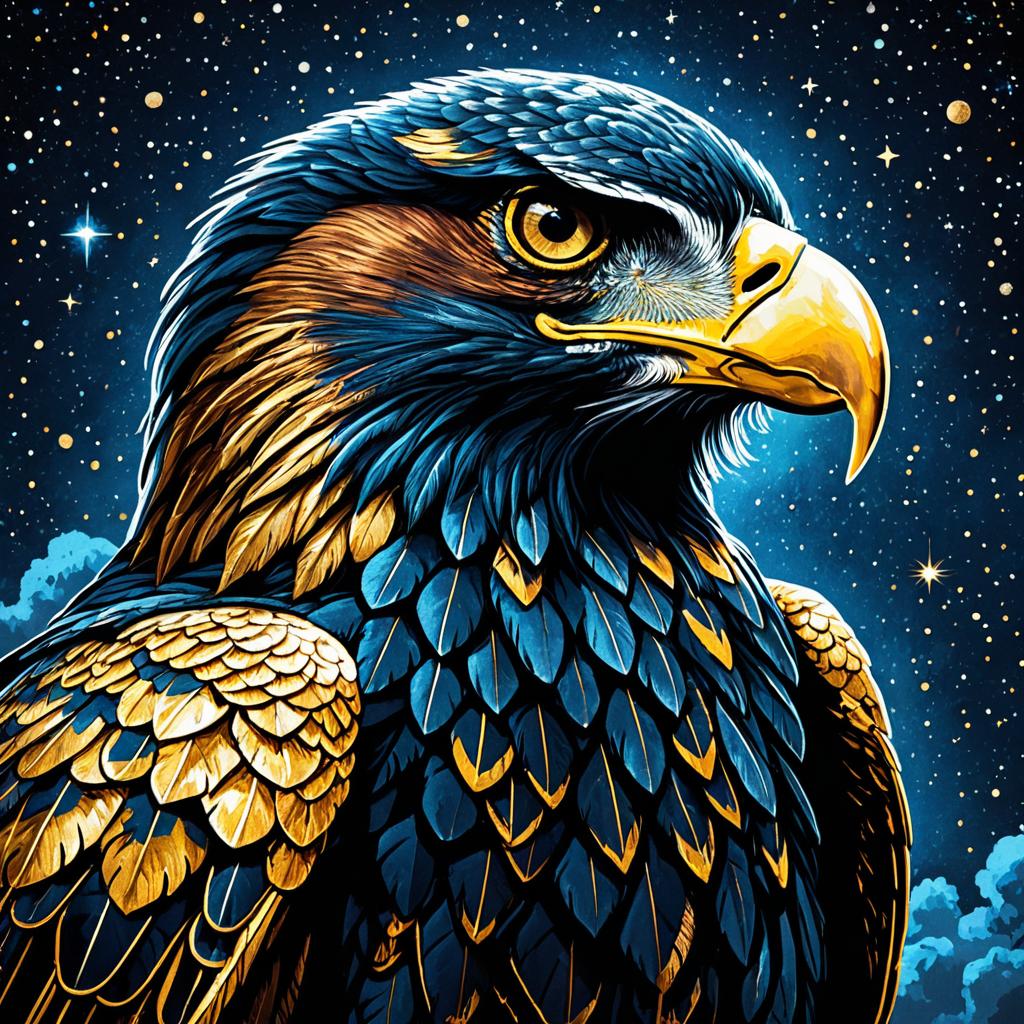 Illustration in the style of James Gurney, featuring an astral hawk, futuristic and celestial themes, detailed with gold leaf, night sky setting, intense color contrast