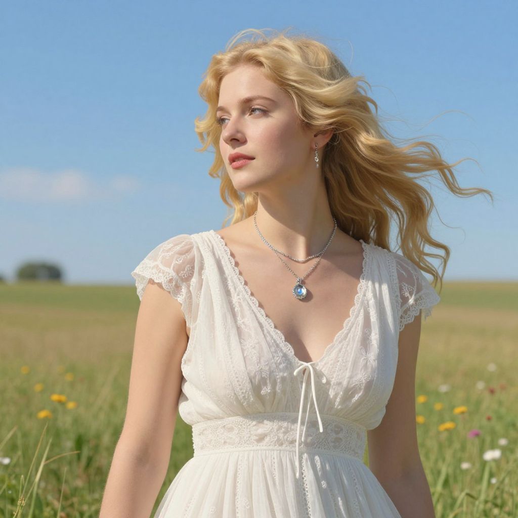 A serene American figurative illustration captures a woman with flowing blonde hair, adorned in a delicate white dress and sparkling jewelry, set against a vibrant meadow under a clear blue sky, evoking a classic painterly style with soft, natural lighting and a dreamy, pastoral ambiance.