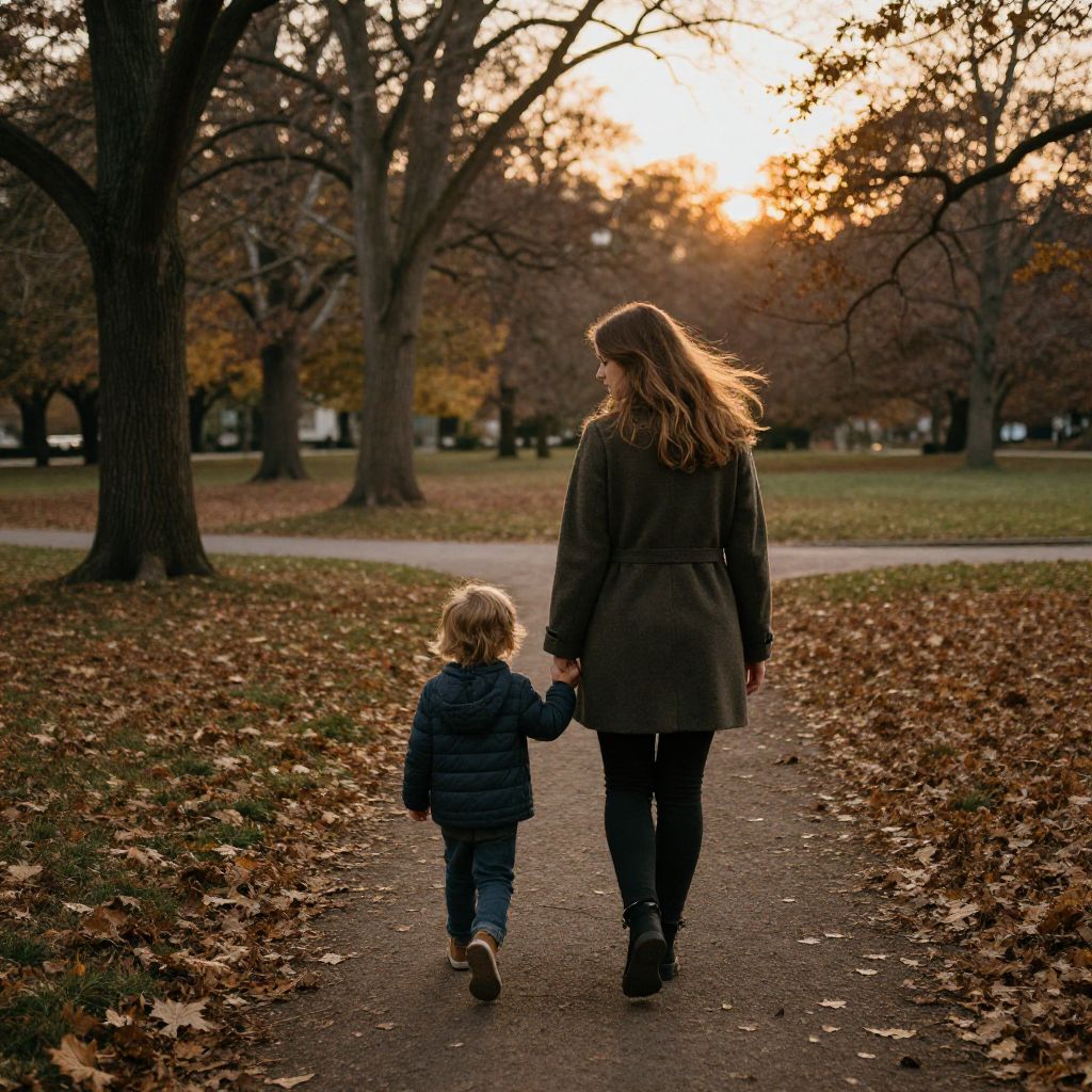 Photograph of a mother and child walking hand-in-hand on a leaf-strewn park path during autumn. The mother, with long brown hair, wears a dark green coat and black pants, while the child, with blonde hair, wears a blue quilted jacket and jeans. The sun sets in the background, casting a warm, golden light through the bare trees. Fallen leaves cover the grass on either side of the path. The mother's back is to the camera, and the child looks forward, holding her hand. The scene is peaceful and serene, with a soft, warm glow from the setting sun.
