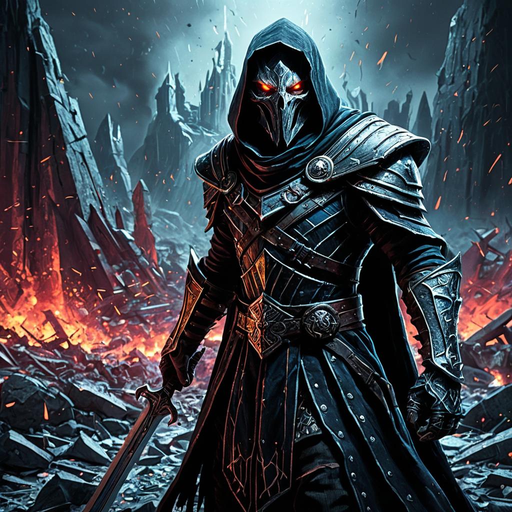 Beautiful cinematic fantasy poster, warrior, heavy armor, scarred face, glowing crimson eyes, cel-shaded style by darius zawadzki, hybrid of elden ring, artgerm, and wayne reynolds