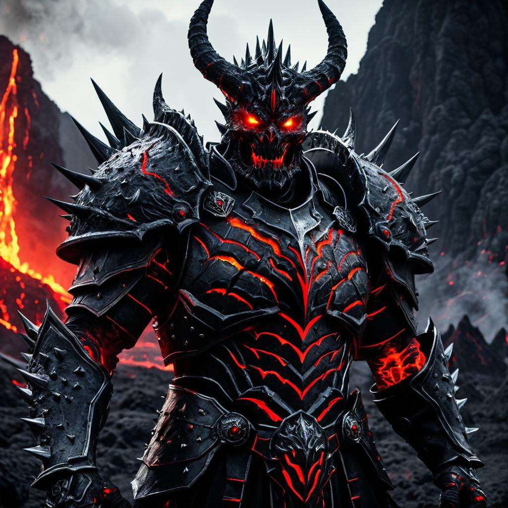 Close-up portrait of a fantasy warrior clad in intricate heavy armor with a scarred face partially revealed beneath a horned helmet. The warrior's eyes glow crimson, adding a menacing and mystical aura. The armor features detailed engravings, rivets, and crimson gem accents, set against a dark forest background with floating embers. The image blends cel-shaded style with elements inspired by Elden Ring and fantasy art.