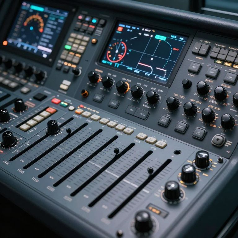 Fuzzy an incredibly complicated dashboard and instrument panel, with numerouos buttons, intricate sliders, minute dials and black knobs,
