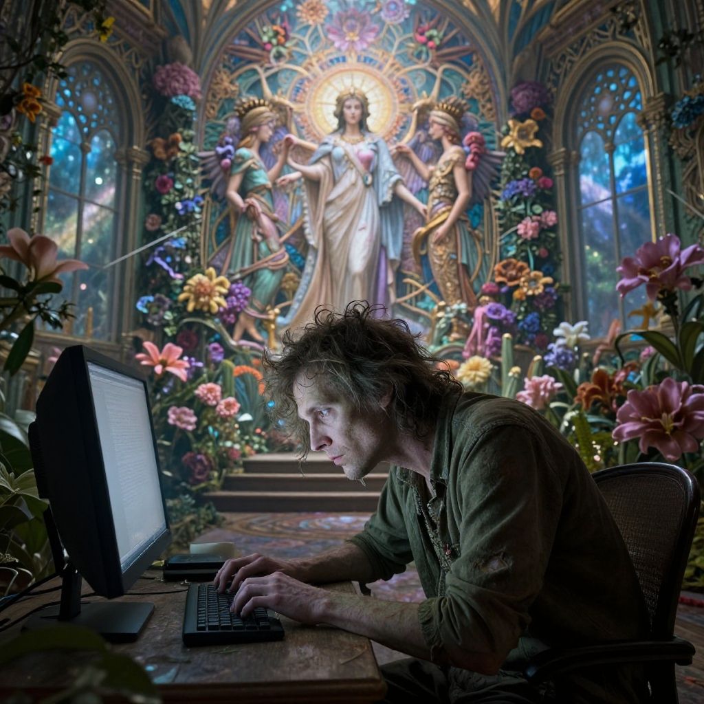 Photograph of a disheveled man typing on a laptop in a vibrant, floral, gothic cathedral, with a radiant, angelic figure and
