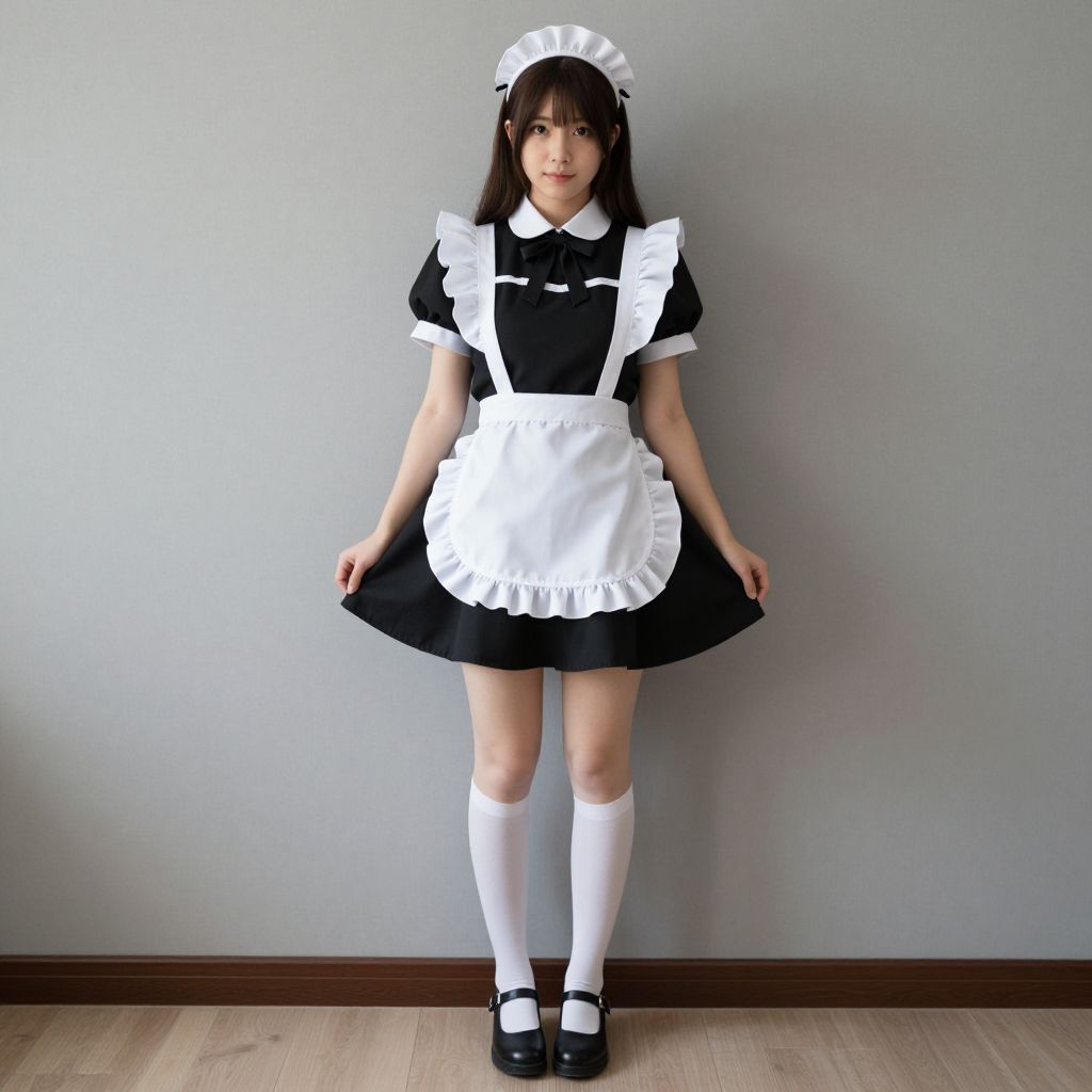 Photograph of an Asian woman in a black and white French maid outfit, standing against a plain gray wall, wearing white knee-high socks and black Mary