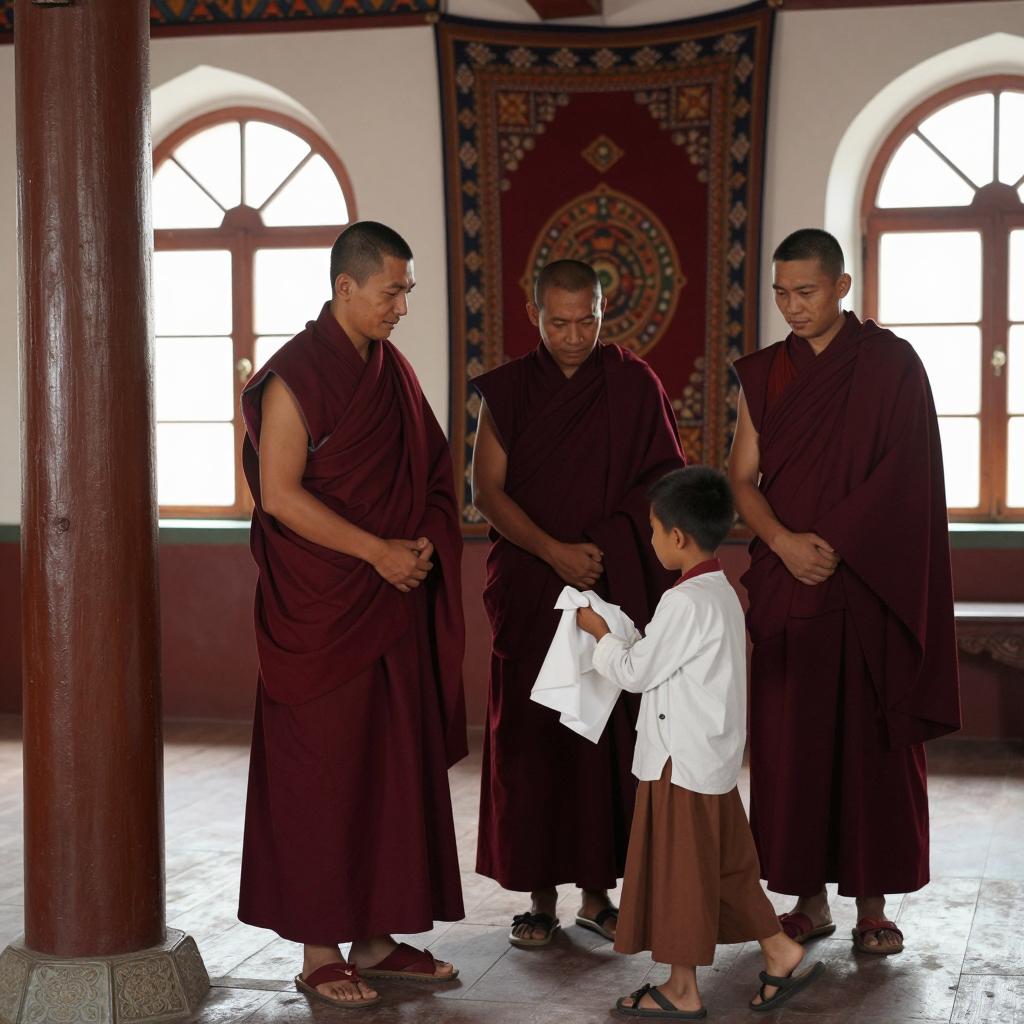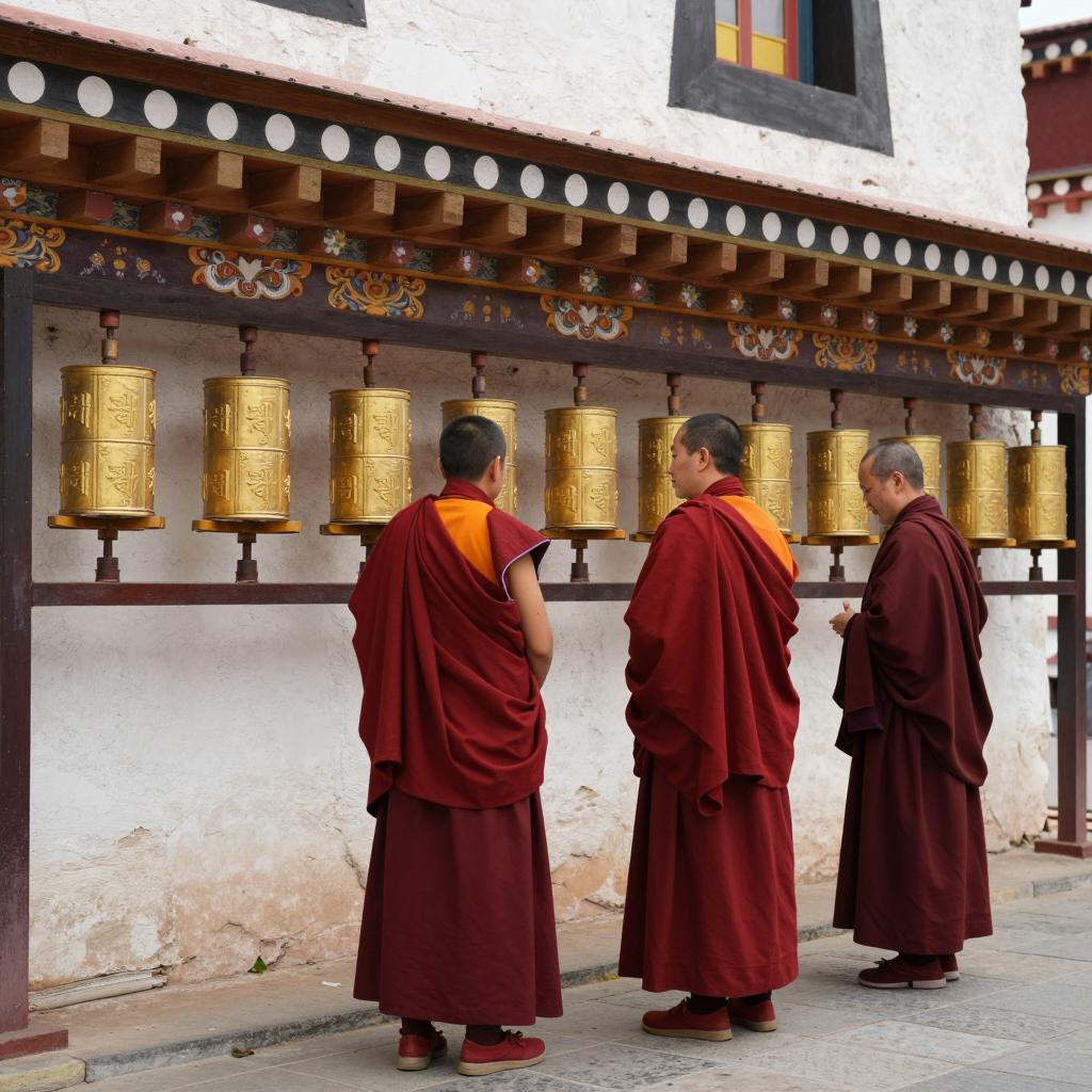 Three Buddhist monks dressed in traditional red and orange robes standing in meditation or conversation near a wall with a row of golden prayer wheels and decorated upper frieze, stone tiled ground, peaceful spiritual atmosphere, Himalayan temple courtyard, soft natural daylight