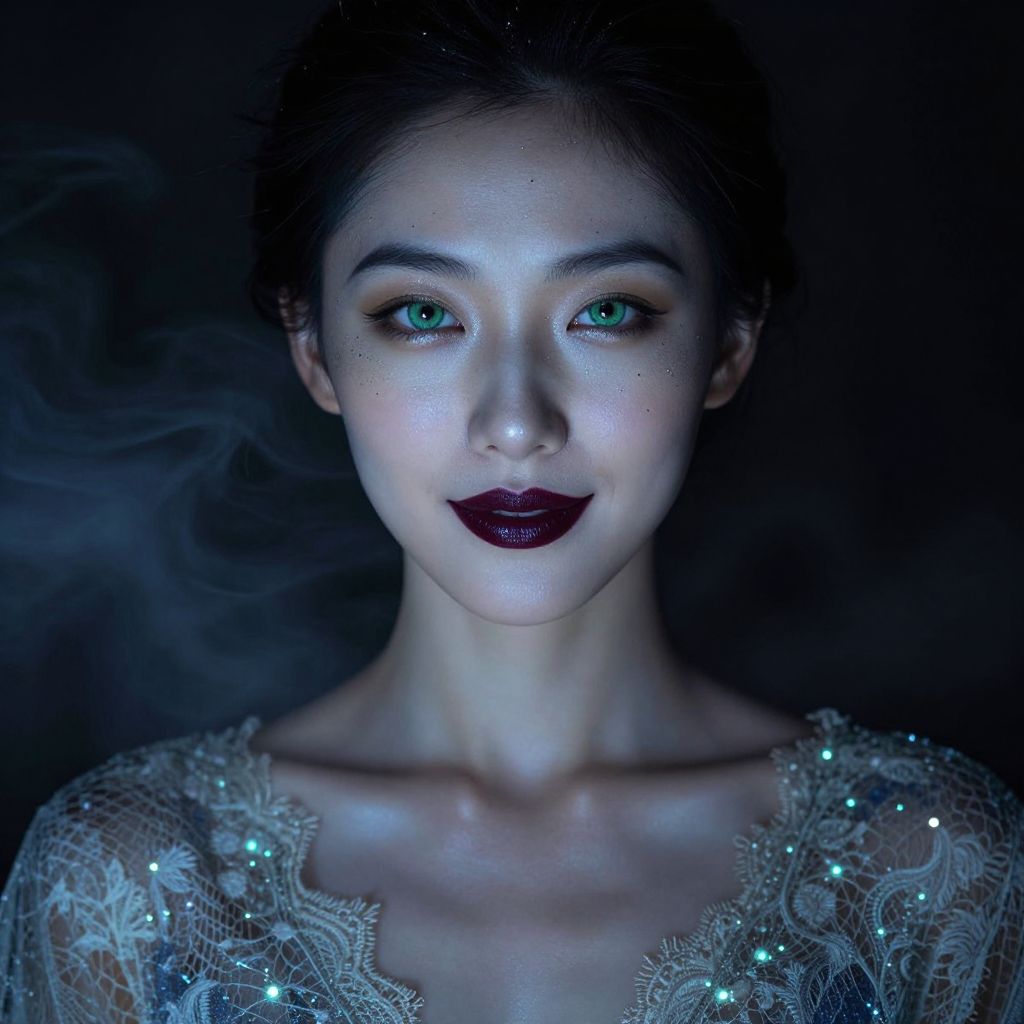 Craft a hyper-realistic digital portrait with an enigmatic surrealist twist, focusing on a close-up of an East Asian woman's porcelain skin. Adorned in iridescent particles shimmering in midnight blue and silver, her emerald eyes, full of untold secrets, gaze off-camera with a knowing smile. Her lips, painted deep burgundy, add to the allure. The vintage lace gown, adorned with subtle bioluminescent patterns, reflects ambient light, creating an interplay between darkness and luminosity. Framed by ethereal mist swirling around her like a cloak, she embodies an elusive otherworldly being seamlessly integrated into reality. This captivating figure invites viewers to become entangled in the spellbinding mystery of her enigmatic presence.
