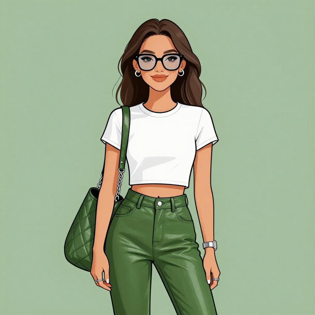 Woman with pretty face and pretty hair. smiling Woman, street style, cropped white t-shirt, high-waisted green faux leather pants, quilted pattern, tote bag with chain strap, clear lens rectangular glasses, silver watch, minimalistic rings, stud earrings, studio background with a green tint. --sref 1467