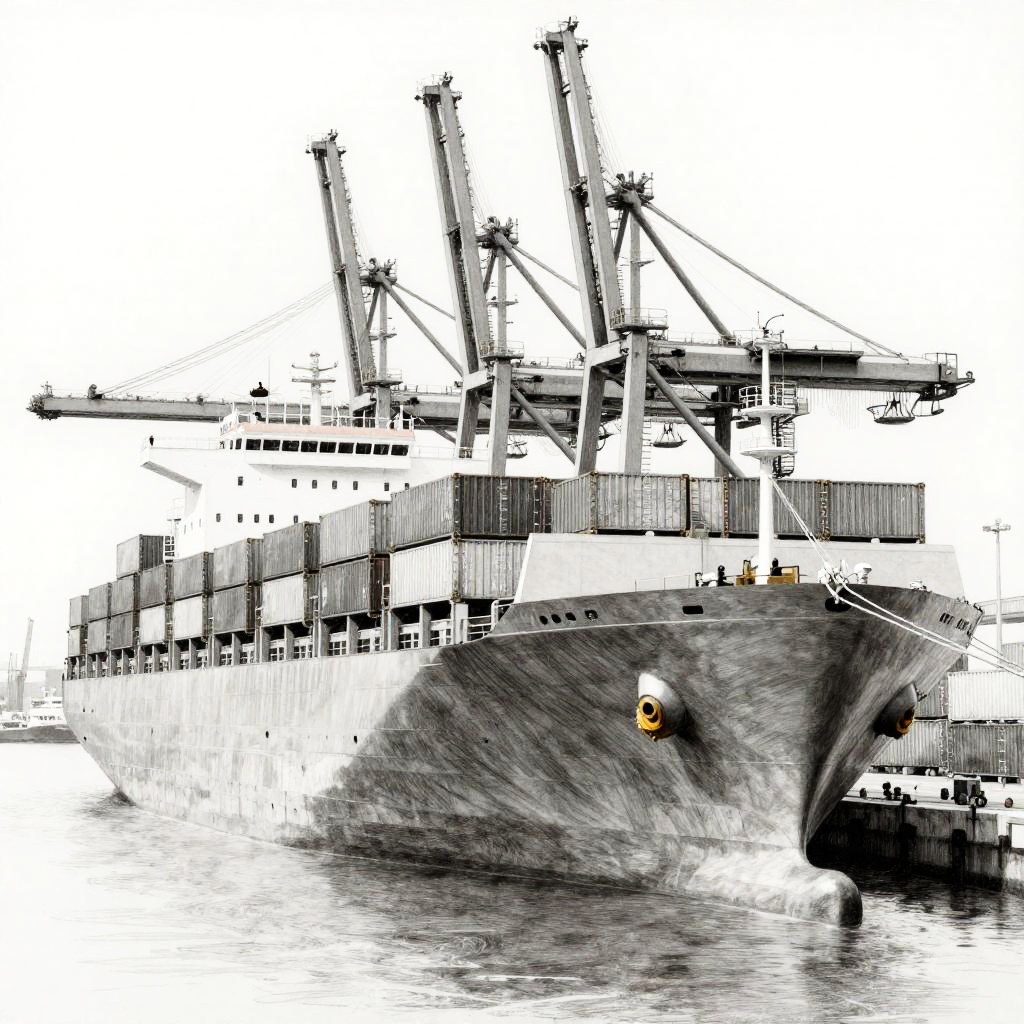 Ship pencil drawing of a modern cargo ship docked at a bustling harbor, precise lines and soft shading to depict containers and cranes, blending technical accuracy with artistic pencil sketch aesthetics.