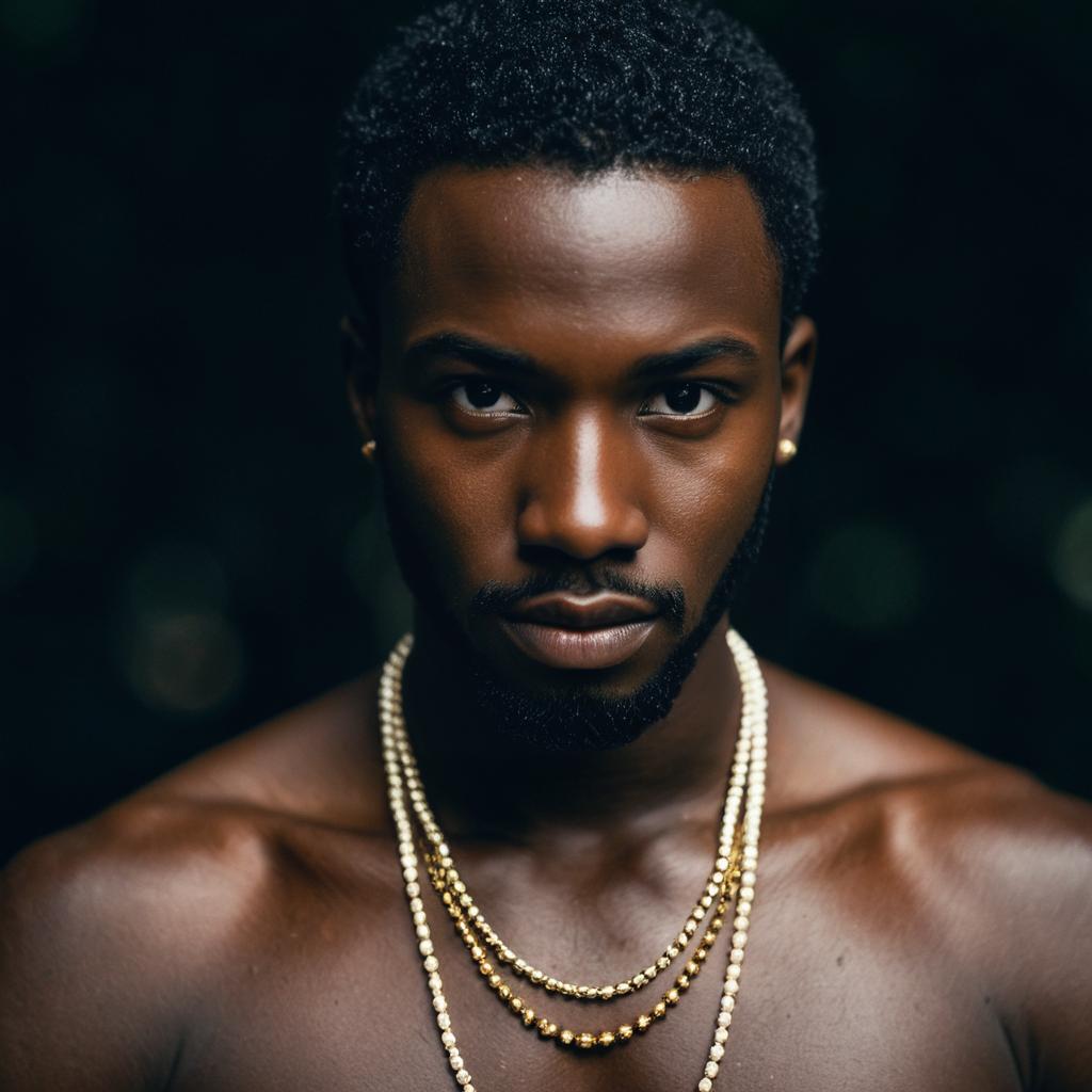 Traditional xhosa attire man,1boy, male focus, solo, necklace, jewelry, hat, looking at viewer, facial hair, blurry, blurry background, outdoors, dark-skinned male, upper body, own hands together