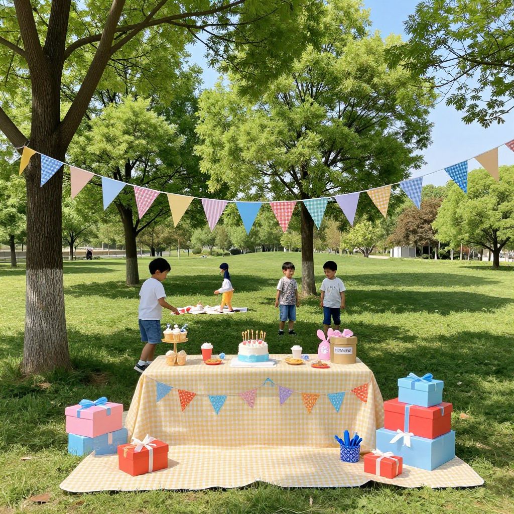 Outdoor birthday picnic scene featuring a decorated table with birthday cake and presents, colorful bunting flags hanging from trees, children playing nearby under a clear sunny sky, a joyful and lively celebration in a lush green park.