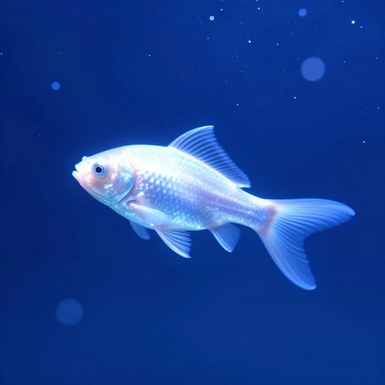 Photograph of a single, glowing white fish with iridescent blue highlights swimming in a deep, dark blue underwater setting. The fish has a round, slightly protruding mouth, large blue eyes, and translucent fins and tail. Small, scattered bubbles float around the fish, adding to the aquatic ambiance. The fish's scales shimmer, reflecting light, and its body is slightly elongated with a prominent dorsal fin. The background is a uniform, deep blue, enhancing the fish's bright, luminous appearance. The overall composition emphasizes the fish's ethereal and delicate presence in the underwater environment.
