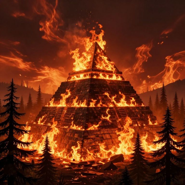 A digital illustration depicting a towering, Gothic-style building engulfed in bright, intense orange and yellow flames. Four ornate, glass lanterns with clock faces float around the burning structure against a dark, smoky sky. The building's architectural details, including pointed spires and vertical lines, are vividly outlined by the fire. Debris and rocks are scattered at the base of the flames, adding to the dramatic scene. The overall style is hyper-realistic with a focus on intense, dynamic lighting and dramatic contrast between the fiery flames and the dark background.