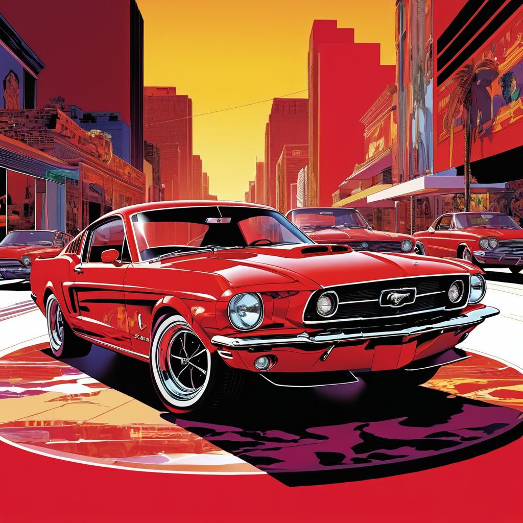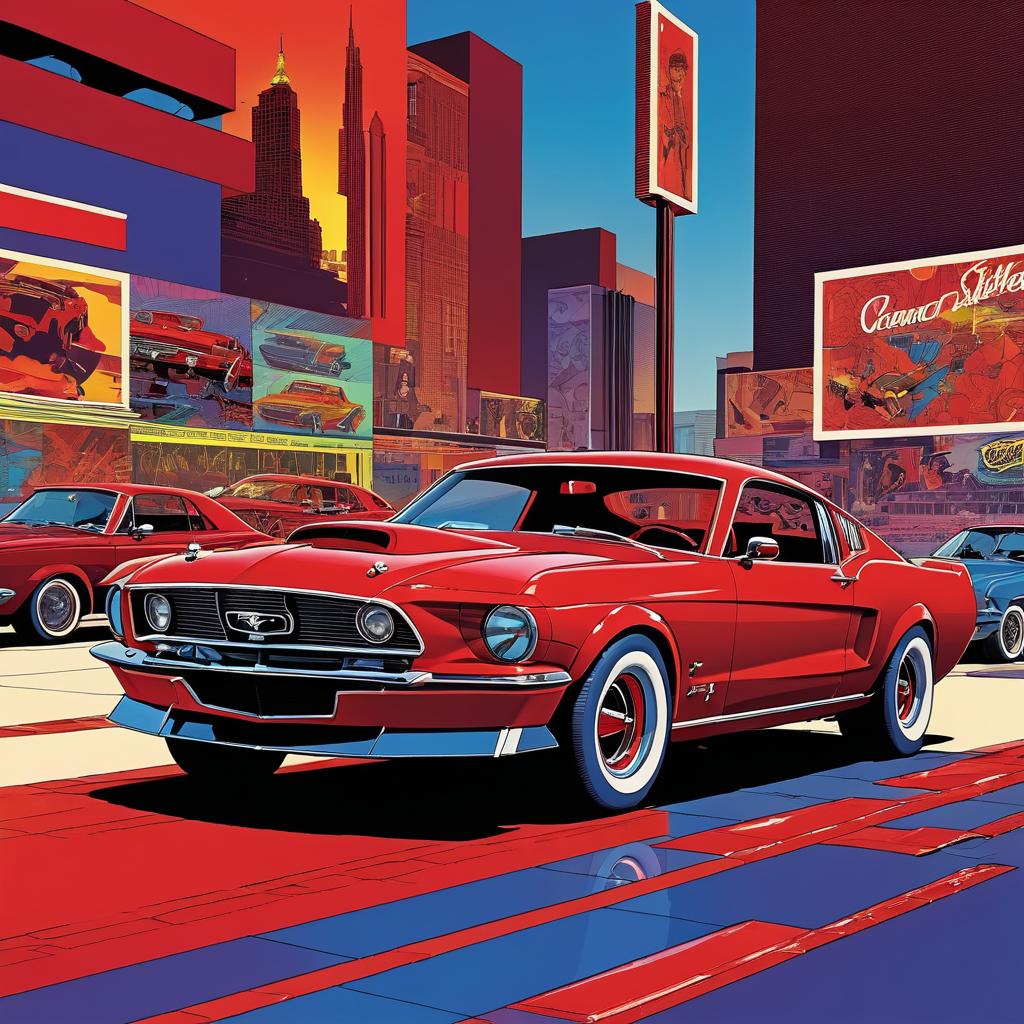 A digitally illustrated red 1960s Ford Mustang prominently displayed in an urban environment with skyscrapers and vibrant billboard art. The image features bold and vivid colors with a graphic novel style influenced by Frank Miller, incorporating dynamic shading and comic book aesthetics.